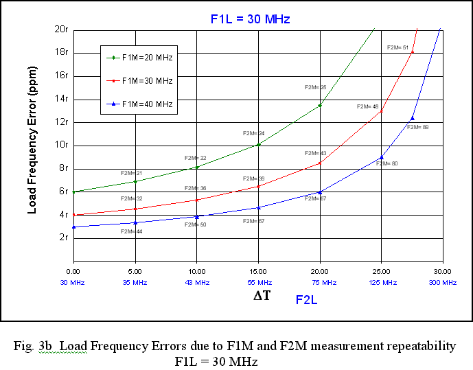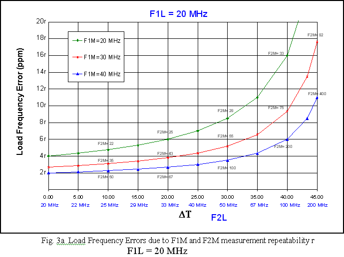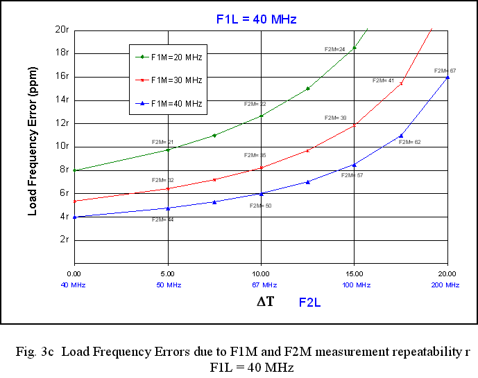 The example has an initial load frequency of F1L = 44 MHz and a DT of about 1. The monitor frequency is 31 MHz. The closest curve in Fig. 3c is that for F1M = 30 MHz. For a DF = 1, it shows an error of about 5r. Assuming r = 40, one obtains a monitor frequency error of 200 ppm.