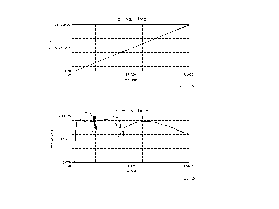 The average measurement time [Dt] av. can be determined from the frequency vs. time curve (such as Fig. 2). We define F1 = initial freq. (begin of etching), F2 = final freq., Fo = (F1 + F2) /2 = mean frequency, d F = (F2-F1) = total freq. change, d F / Fo = total relative freq. change, dt = total etch time, and obtain